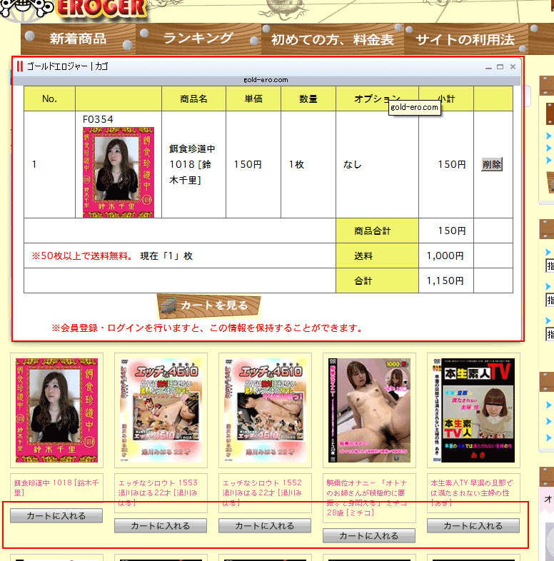 - 当サイトでは、お客様に便利に購入してもらうため、「カートに入れる」ボタンを押しますと、別ウィンドのカートが表示されます。
